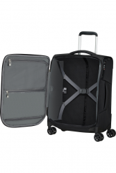 • Внутри: фиксирующие ремни в основном отделении, в крышке чемодана - тканевая перегородка на молнии
