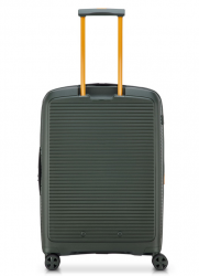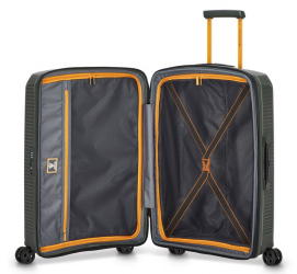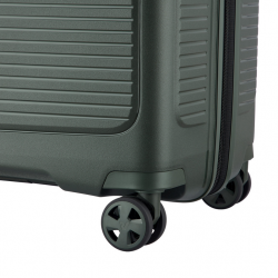 Чемодан изготовлен из полипропилена на 100% переработанного материала, который предлагает: максимальную ударопрочность, чрезвычайную прочность, оптимальную лёгкость, термостойкость. Оснащена 4 спаренными и маневренными колесами. Для удобства перемещения предусмотрена гибкая, подъемная пластиковая ручка на верхней и боковой панелях, а также телескопическая ручка. Безопасность и сохранность багажа обеспечивает встроенный кодовый замок с системой TSA. Изделие состоит из двух больших отделений, оснащенных разделителями и эластичными прижимными ремнями. Также имеет расширение для увеличения пространства для вещей.